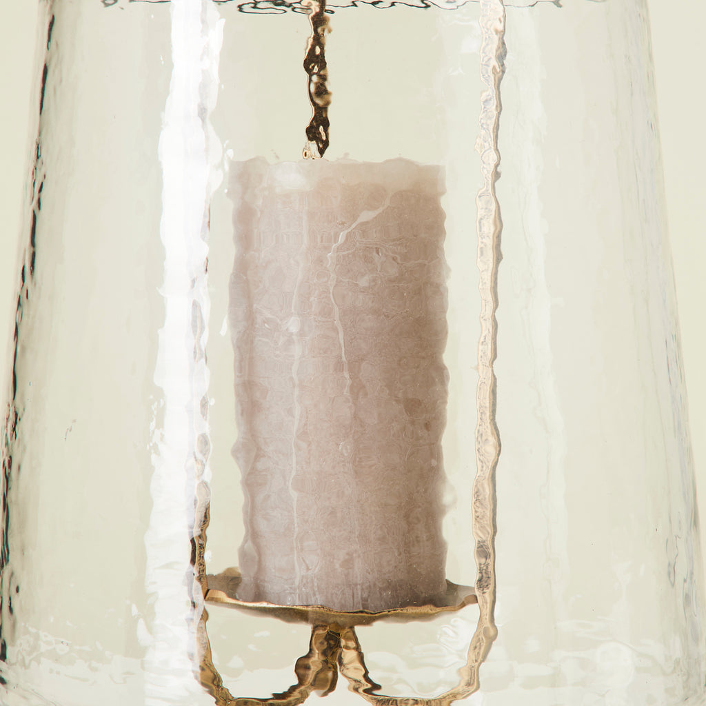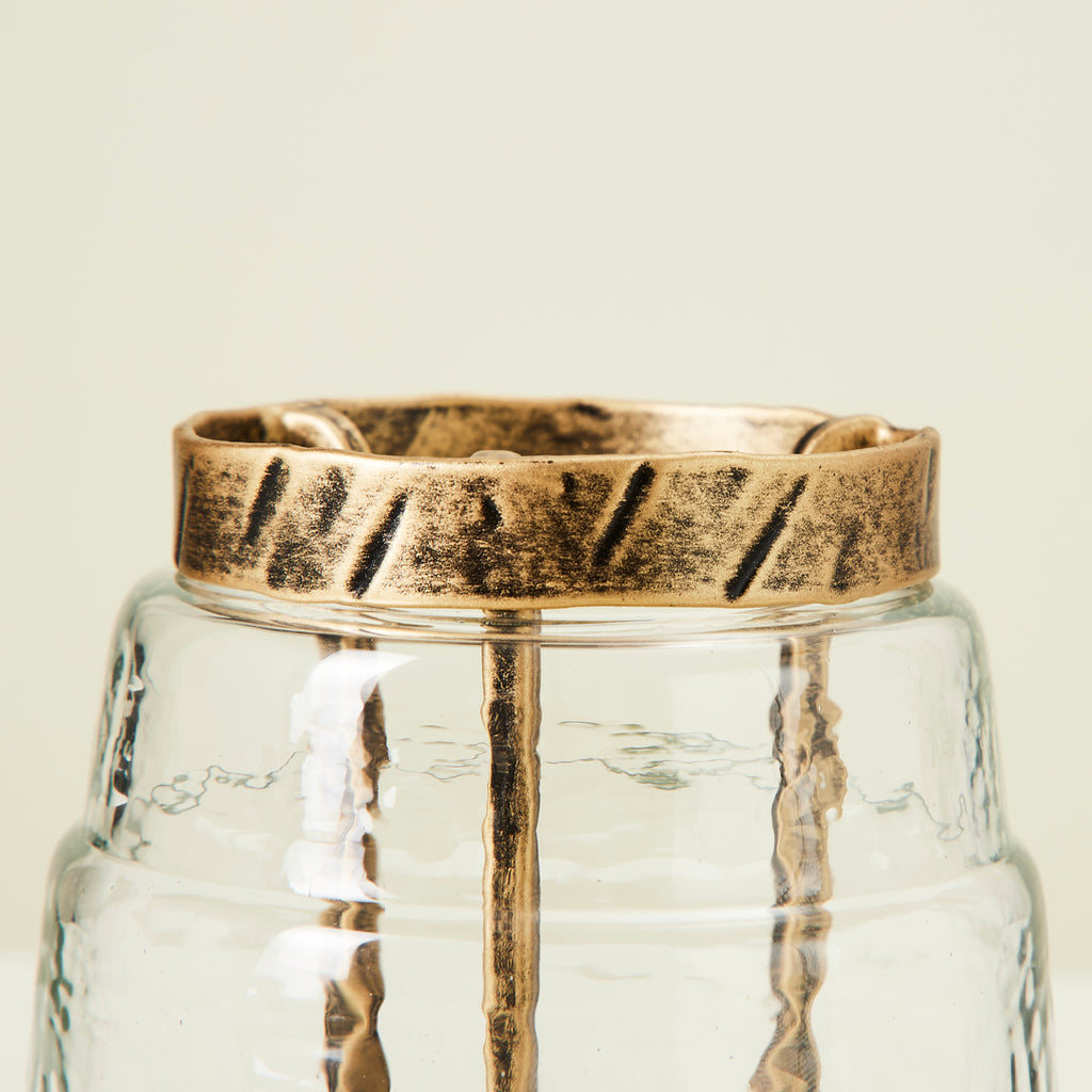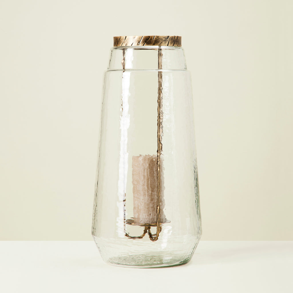 The perfect object for adding a touch of antiquity to any interior. This candleholder is crafted with clear hammered glass and finished with classical gold metal to effortlessly fit into your space.
