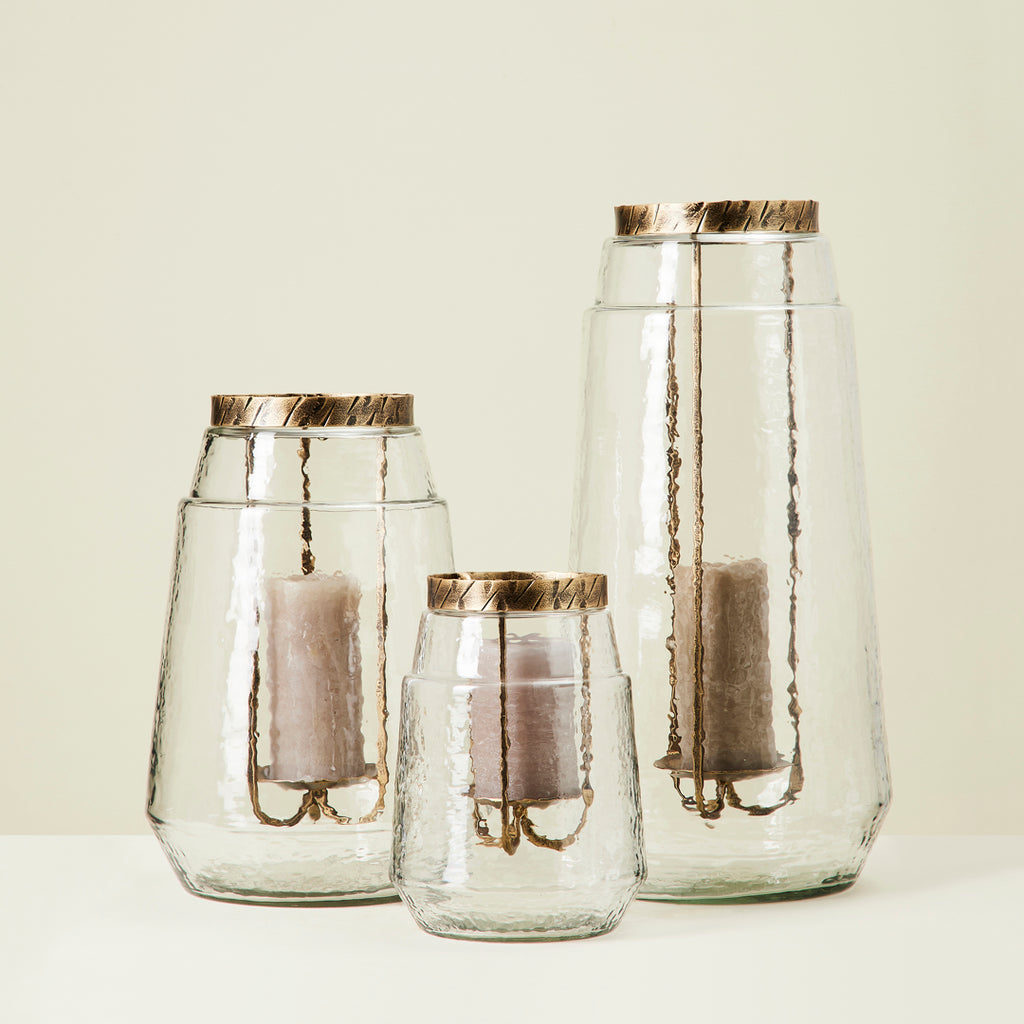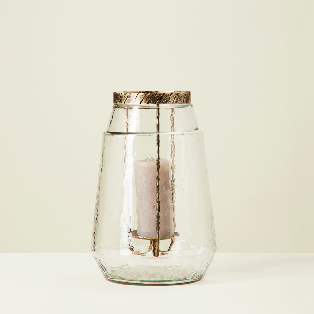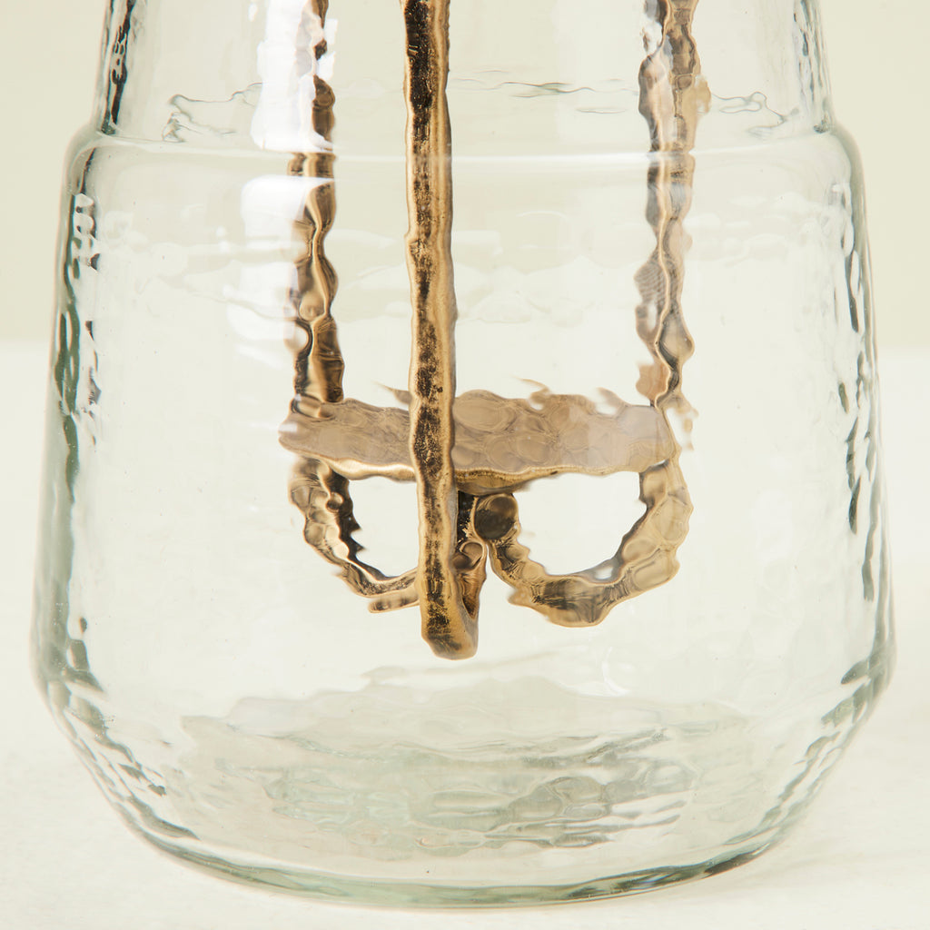 The perfect object for adding a touch of antiquity to any interior. This candleholder is crafted with clear hammered glass and finished with classical gold metal to effortlessly fit into your space.