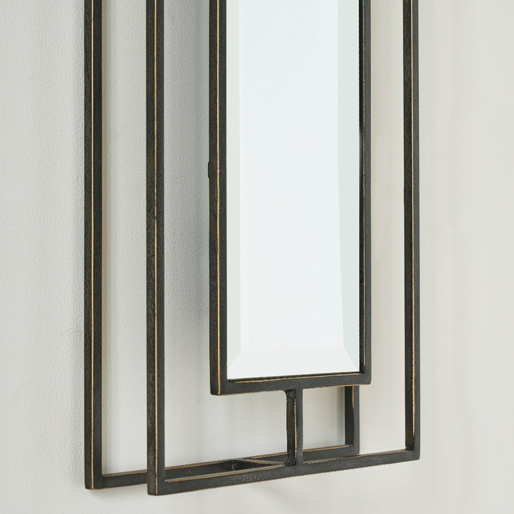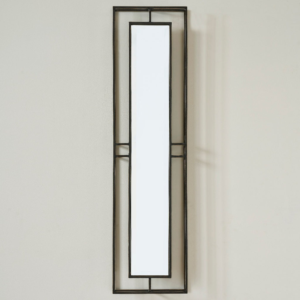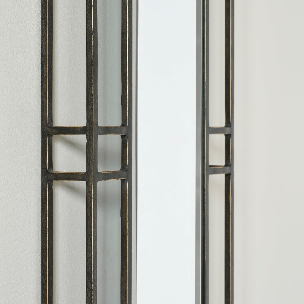 A clear, vertical mirror with a sleek skeleton in a gilded oak wood finish. A modern, minimal design that can be added singularly or a in a cluster over a console table or in the corner of a room reflect to the story of your space.