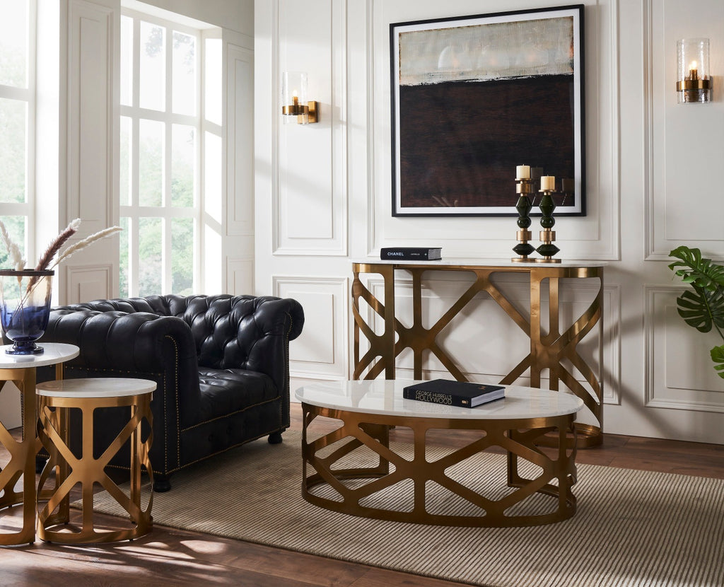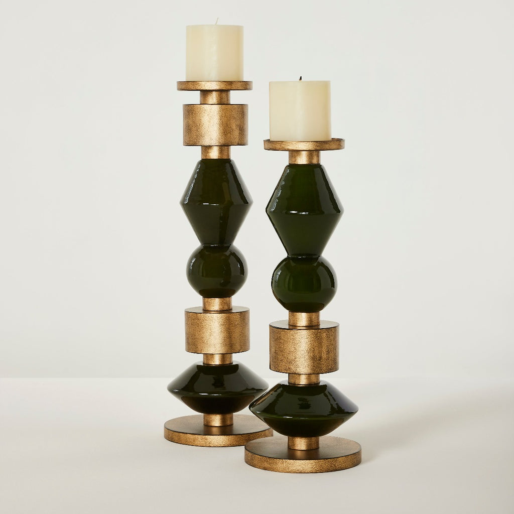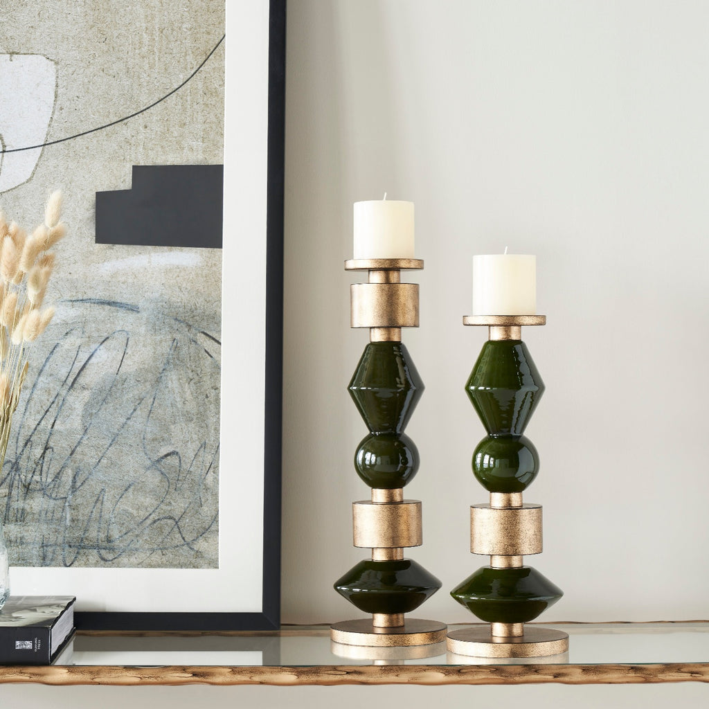 A pillar with a combination of glass and metal structures aligned on top of each other in an opal sap green, and an aged champagne finish. A quaint and quirky addition in opaque colors, fit to place as a set in a console or a coffee table.